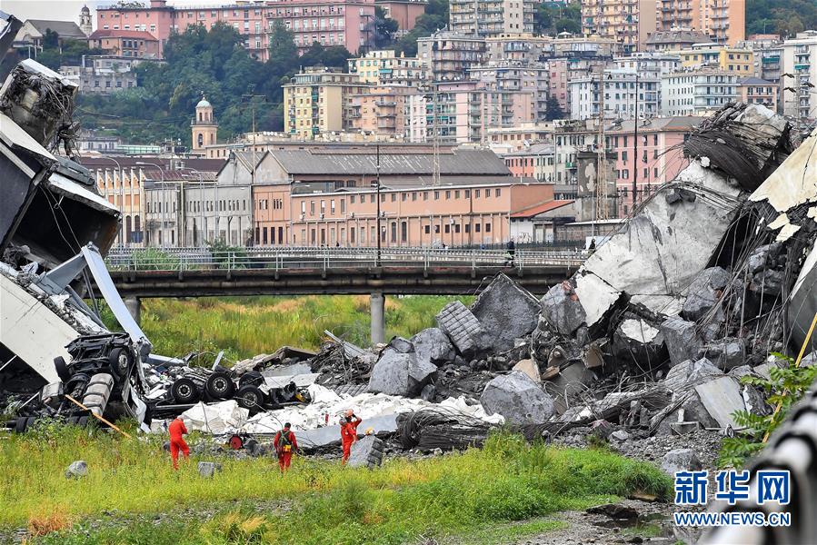这是8月14日在意大利北部热那亚地区拍摄的大桥垮塌现场。新华社发(阿尔贝托·林格里亚摄)
