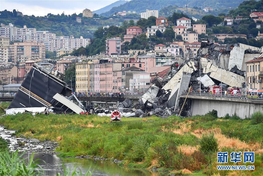 这是8月14日在意大利北部热那亚地区拍摄的大桥垮塌现场。 新华社发(阿尔贝托·林格里亚摄)