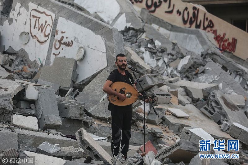 当地时间2018年8月15日,加沙加沙城,埃及“Devavin”乐队在被以军空袭过的Said al-Mishal文化中心废墟上表演。(图片来源:视觉中国)