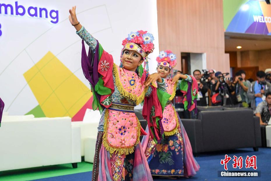 当地时间8月16日,5位印度尼西亚的女孩身着当地传统服饰在雅加达亚运会新闻中心翩翩起舞,欢迎来此的亚奥理事会官员与各国新闻记者。 中新社记者 杨华峰 摄