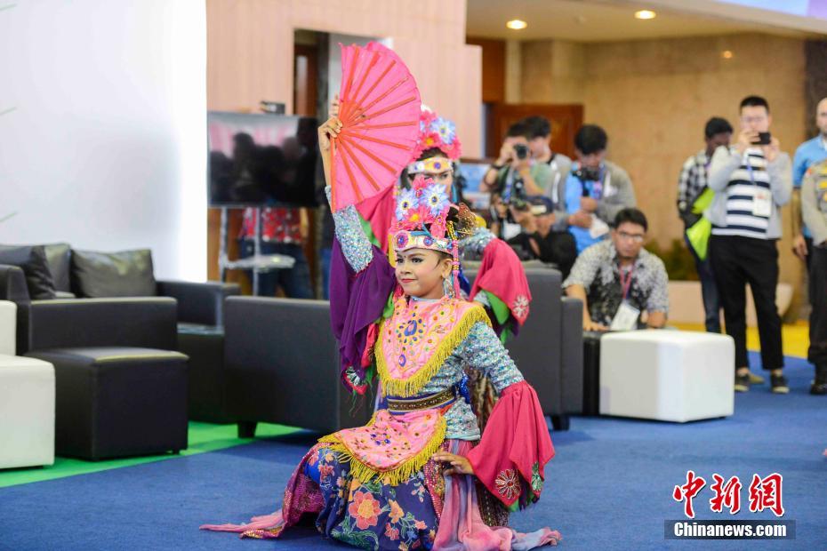 当地时间8月16日,5位印度尼西亚的女孩身着当地传统服饰在雅加达亚运会新闻中心翩翩起舞,欢迎来此的亚奥理事会官员与各国新闻记者。 中新社记者 杨华峰 摄