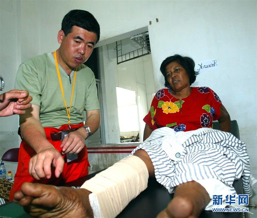 这是2005年1月15日,在印度尼西亚班达亚齐总医院,中国国际救援队医生为一名腿部骨折的海啸灾民检查病情。 新华社记者龚兵摄