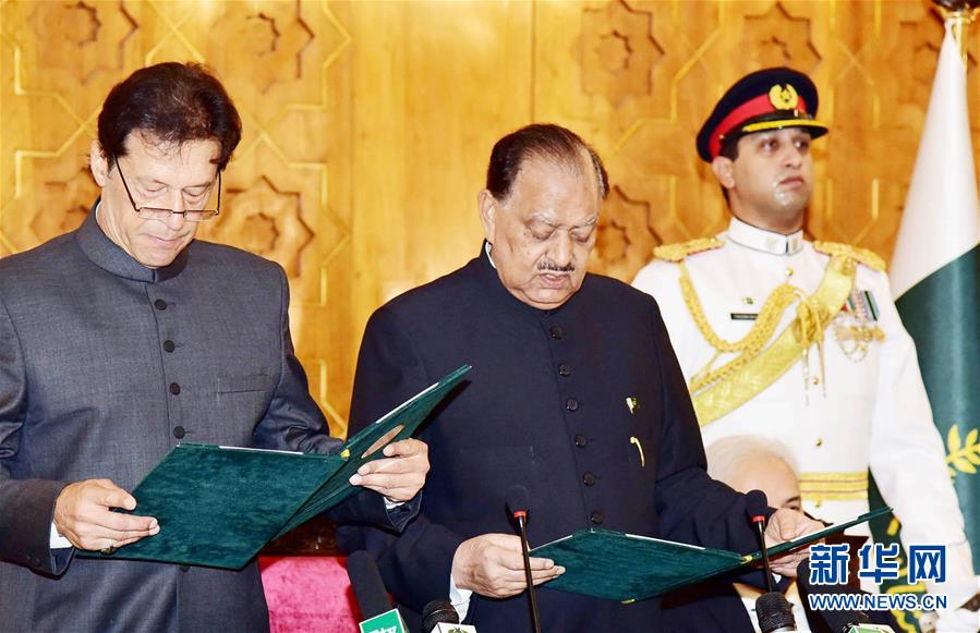 8月18日,在巴基斯坦伊斯兰堡,巴基斯坦总统侯赛因(中)主持新当选总理伊姆兰·汗(左)的宣誓就职仪式。