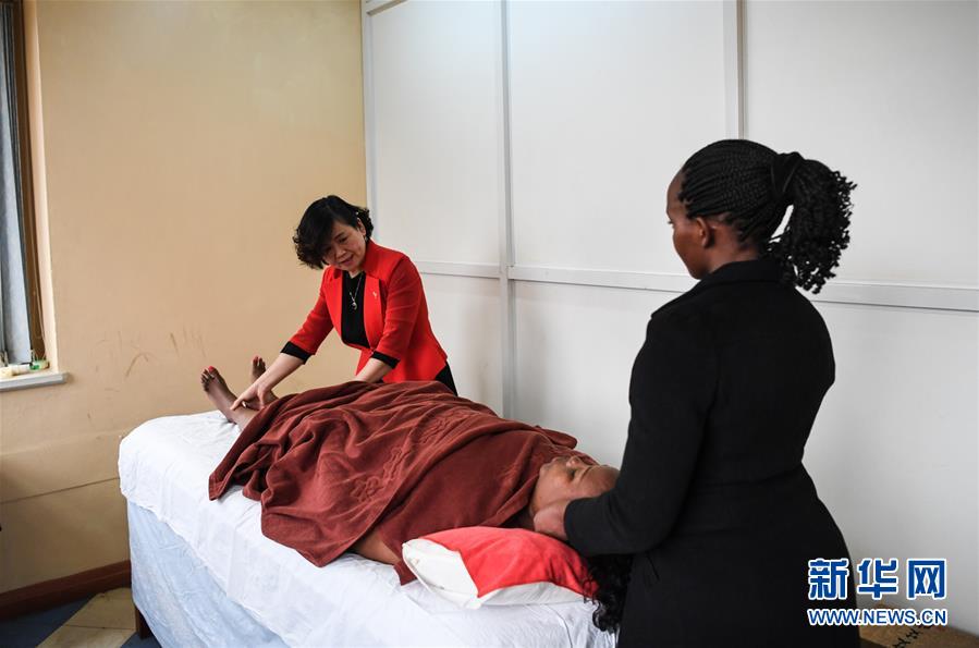 8月17日,潘连雪在肯尼亚内罗毕的诊所内给当地员工讲解推拿技巧。罗占良、潘连雪夫妇在肯尼亚首都内罗毕经营一家中医诊所,每天来预约治疗的患者络绎不绝。他们在肯尼亚行医20多年,让越来越多的非洲人认识中医、了解中医、接受中医。潘连雪说,“因为中医,我留在了肯尼亚;因为中医,我在这里认识了我先生。同时,很多患者因为中医,对中国产生了浓厚的兴趣。每想到这些,我的成就感就油然而生”。新华社记者 李琰 摄