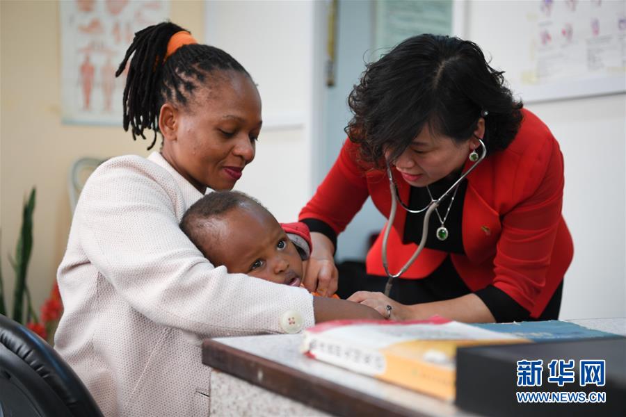 8月17日,潘连雪在肯尼亚内罗毕的诊所内为小患者听诊。罗占良、潘连雪夫妇在肯尼亚首都内罗毕经营一家中医诊所,每天来预约治疗的患者络绎不绝。他们在肯尼亚行医20多年,让越来越多的非洲人认识中医、了解中医、接受中医。潘连雪说,“因为中医,我留在了肯尼亚;因为中医,我在这里认识了我先生。同时,很多患者因为中医,对中国产生了浓厚的兴趣。每想到这些,我的成就感就油然而生”。新华社记者 李琰 摄
