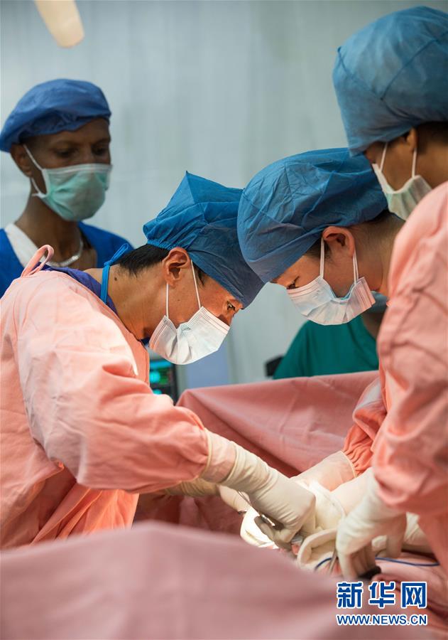 8月17日,在埃塞俄比亚首都亚的斯亚贝巴市郊的中国-埃塞俄比亚友好医院,主刀医生张天鹏(前左)、助手杜春芳(右二)与当地医护人员一起进行阑尾切除手术。 中国援助埃塞俄比亚第20批医疗队来自河南省一些医院,由16名队员组成,专业涵盖心内科、神经内外科、普外科、骨科、妇产科、麻醉科、针灸科、超声科、影像科等,于2017年8月29日抵达埃塞俄比亚首都亚的斯亚贝巴,进行为期一年的援助工作。 新华社记者吕帅摄