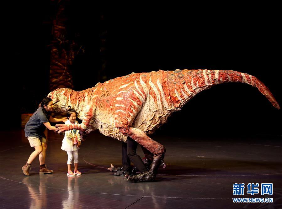 8月19日,在《恐龙动物园》演出中,小观众与“恐龙”拥抱互动。8月17日至19日,由澳大利亚环球剧团带来的科普互动儿童剧《恐龙动物园》在上海儿童艺术剧场上演,为孩子们打造了解史前生物与大自然奥秘的剧场课堂。新华社记者 刘颖 摄