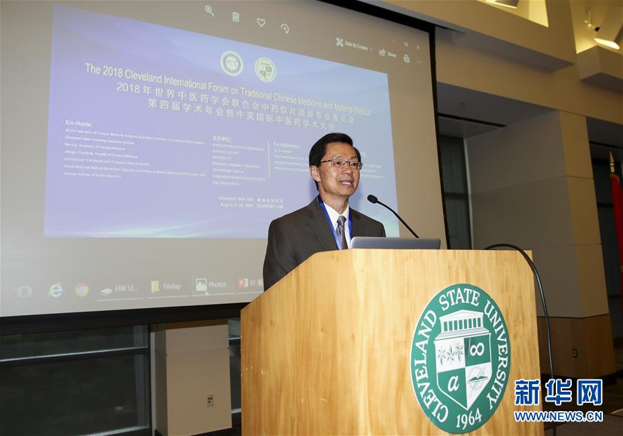 8月17日,克利夫兰州立大学副校长朱建平在美国俄亥俄州克利夫兰举办的中医和中药学国际论坛开幕式上讲话。