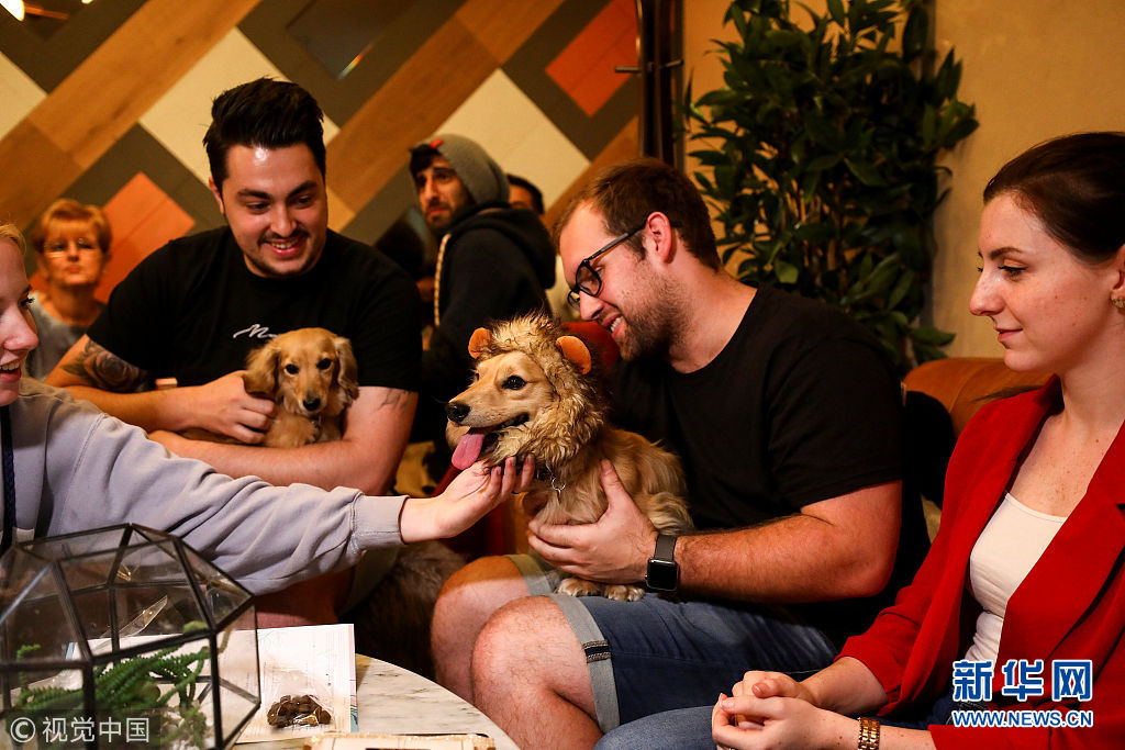 当地时间2018年8月19日,英国伦敦,民众带着宠物达克斯猎肠狗造访达克斯猎肠狗快闪咖啡馆。(图片来源:视觉中国)