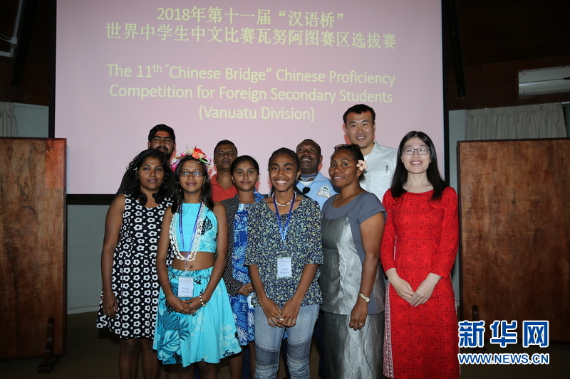 第十一届世界中学生“汉语桥”比赛南太平洋岛国瓦努阿图赛区选拔赛17日在南太平洋大学艾玛卢校区孔子课堂成功举行,共有15位来自瓦努阿图中心学校,维拉东部学校和马拉坡中学的选手积极参与比赛。比赛分为演讲、才艺展示和问答三个环节。尽管多数选手汉语学习时间不足6个月,但他们还是通过清晰的发音、流利的对答及出众的才艺展示赢得了评委和观众的好评,显示出他们的汉语水平和对中国及中华文化的热爱。两名获胜的女选手将于今年10月代表瓦努阿图前往中国参加下一轮比赛。南太平洋大学孔子学院中方院长杨慧及南太平洋大学艾玛卢校区主管鲁本·马克沃德应邀出席并观看了比赛。
