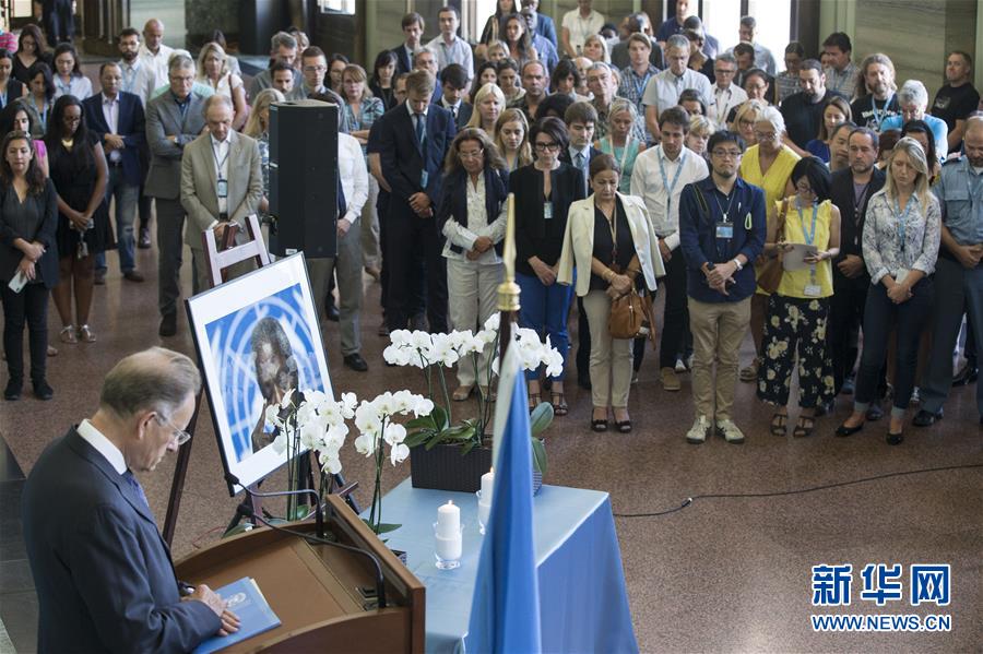 8月20日,在位于瑞士日内瓦的联合国万国宫,工作人员哀悼前秘书长安南。 联合国前秘书长科菲·安南18日在瑞士首都伯尔尼一家医院逝世,享年80岁。 新华社记者 徐金泉 摄