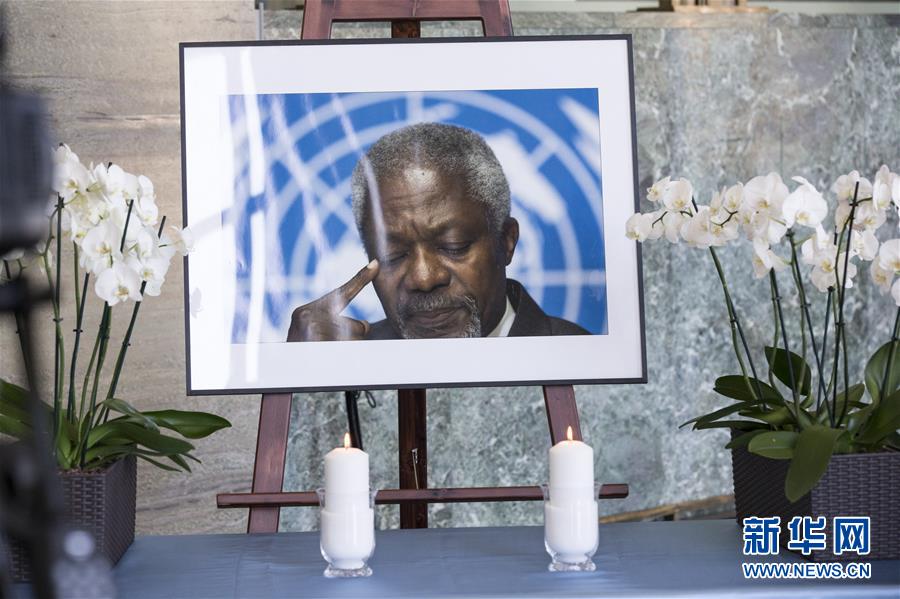 8月20日,在位于瑞士日内瓦的联合国万国宫,前秘书长安南的照片前摆放着蜡烛。 联合国前秘书长科菲·安南18日在瑞士首都伯尔尼一家医院逝世,享年80岁。 新华社记者 徐金泉 摄