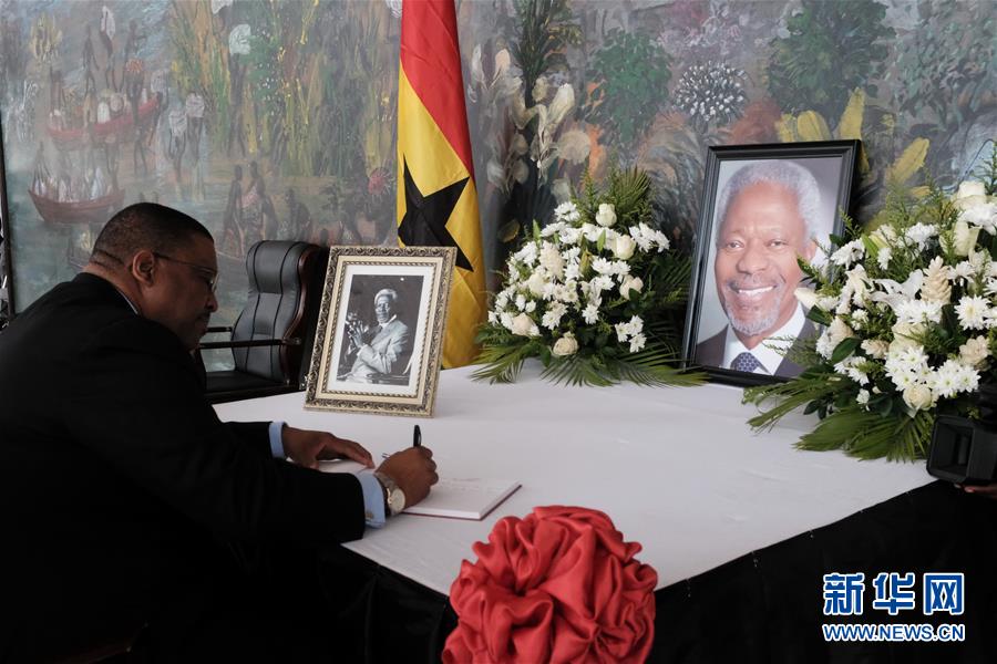 8月22日,在加纳首都阿克拉,纳米比亚驻加纳大使查尔斯·雅索布在吊唁簿上留言悼念联合国前秘书长科菲·安南。 当日,加纳政府在阿克拉国际会议中心设置吊唁簿,悼念联合国前秘书长科菲·安南。8月18日,安南在瑞士逝世,享年80岁。 新华社发(弗朗西斯摄)