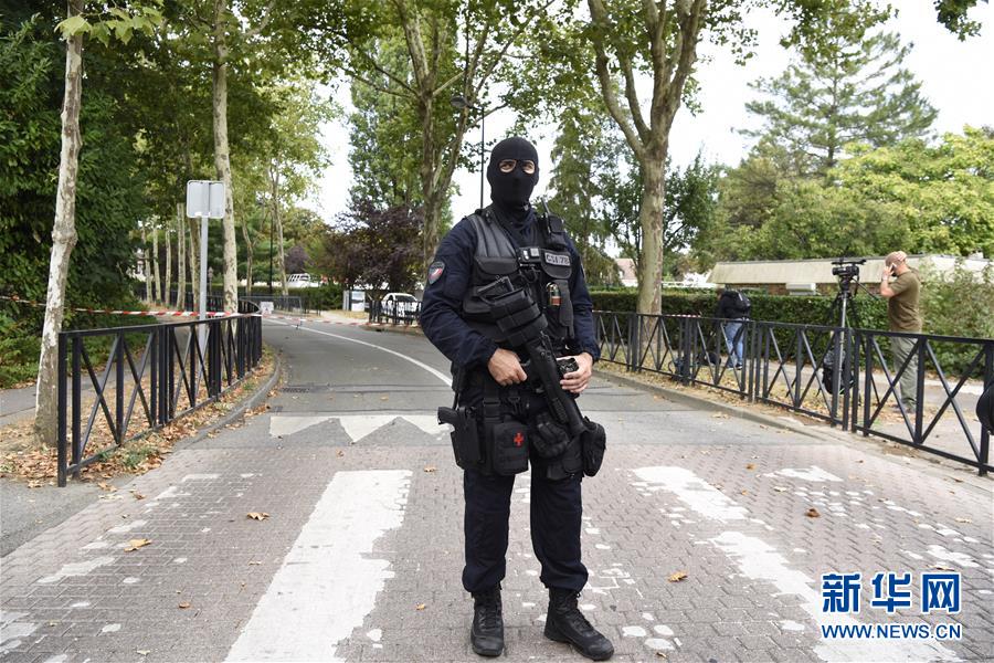 8月23日,在法国巴黎西南郊特拉普市,一名警察在案发现场警戒。 新华社记者陈益宸摄