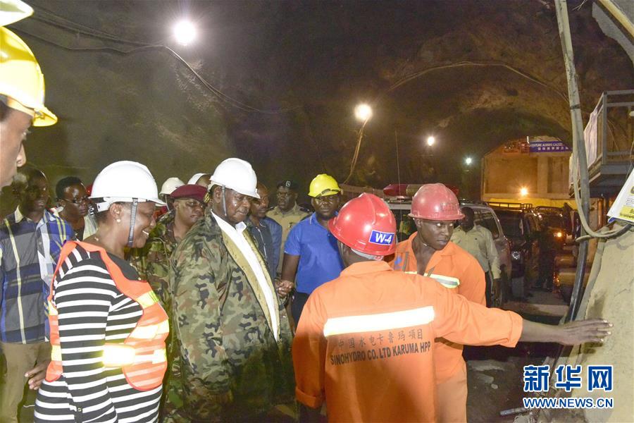 8月23日,在乌干达中西部基里扬东戈地区,乌干达总统穆塞韦尼(中)视察卡鲁玛水电站建设工地。