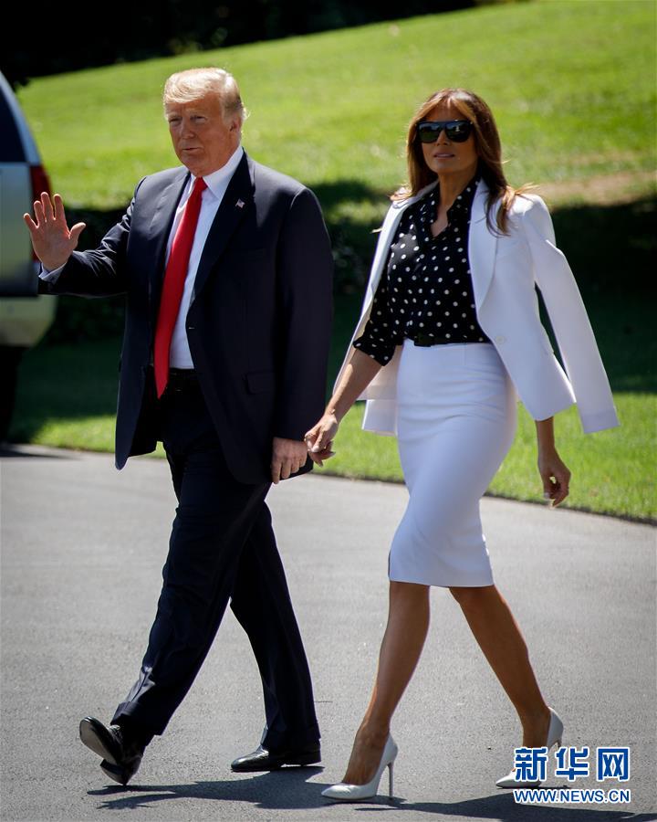 8月24日,在美国首都华盛顿,美国总统特朗普(左)与夫人梅拉尼娅准备离开白宫。美国总统特朗普24日说,他已要求国务卿蓬佩奥推迟下周对朝鲜的访问。新华社发(沈霆摄)