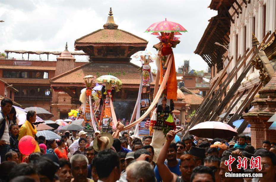 8月27日是尼泊尔加德满都谷地的神牛节。这一天是当地民众纪念亡灵的节日,在过去一年中家里有亲人亡故的尼泊尔人都会参加当天的游行活动。人们按照礼仪为母黄牛装饰,然后跟着母黄牛后面走街串巷,这预示着母黄牛可以带领亡灵顺利通往地府。这一天,最热闹的是加德满都杜巴广场、帕坦杜巴广场、巴德岗杜巴广场。图为巴德岗杜巴广场神牛节活动现场。中新社记者 Sabin Shyama 摄