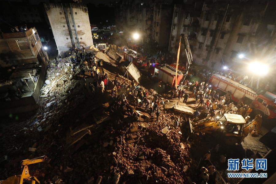 8月26日,在印度艾哈迈达巴德,救援人员在事故现场工作。 印度古吉拉特邦艾哈迈达巴德的一栋4层楼房26日晚发生坍塌,约10人被掩埋。 新华社发