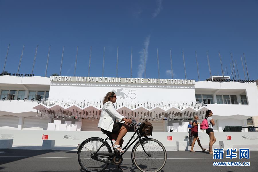 8月28日,在意大利威尼斯利多岛,一名女子骑车路过威尼斯电影节主会场电影宫。 第75届威尼斯电影节将于8月29日至9月8日在意大利水城威尼斯举行。威尼斯电影节诞生于1932年,是世界上第一个电影节。 新华社记者程婷婷摄