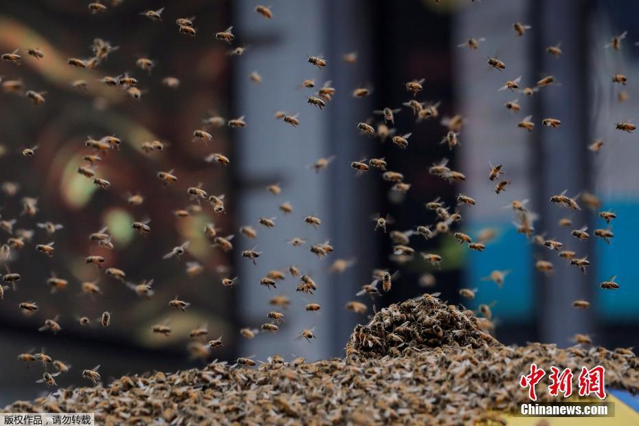 当地时间8月28日,美国纽约时报广场一家热狗摊不知何因引来成群蜜蜂,过往行人纷纷躲避。最后当地消防人员赶来对蜜蜂蜂群进行了驱离。