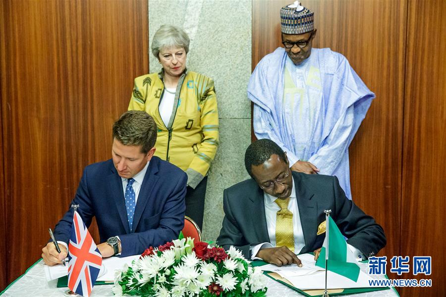 8月29日,在尼日利亚阿布贾,尼日利亚总统布哈里(后右)和来访的英国首相特雷莎·梅(后左)见证两国代表签署双边合作协议。 正在尼日利亚访问的英国首相特雷莎·梅当日表示,英国希望与尼日利亚在经贸和安全事务等方面加强合作。 新华社/尼日利亚通讯社