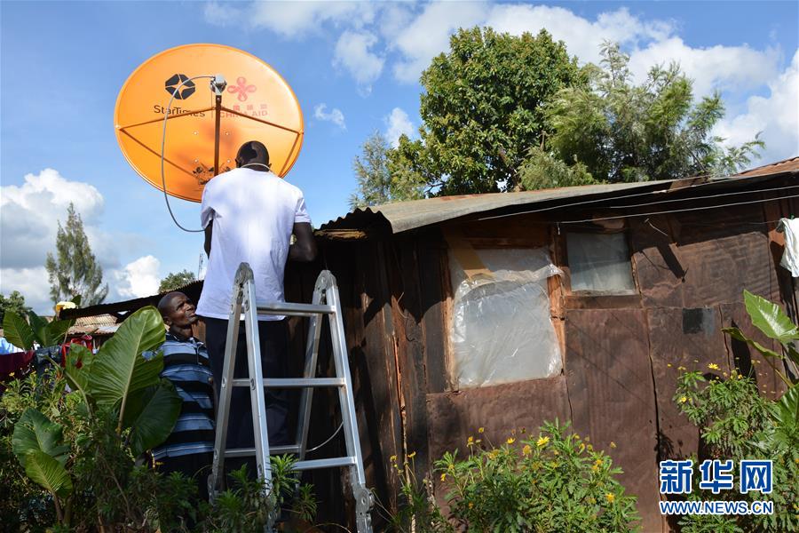 这是2018年7月3日,在肯尼亚莱基皮亚郡利基村,中国企业四达时代集团的两名员工为当地村民安装卫星电视接收设备。 新华社记者金正摄