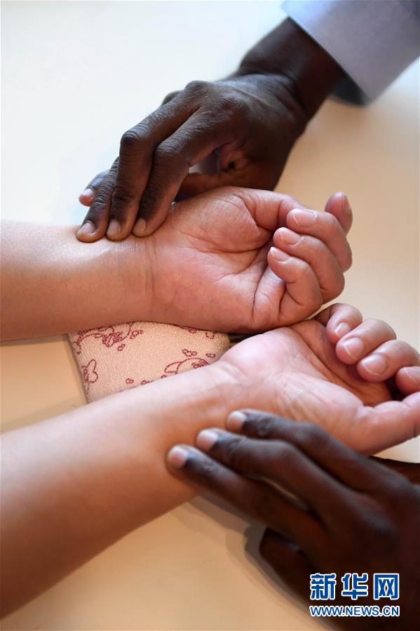 迪亚拉在昆明为一名女士进行双手诊脉(8月28日摄)。 新华社记者 蔺以光 摄