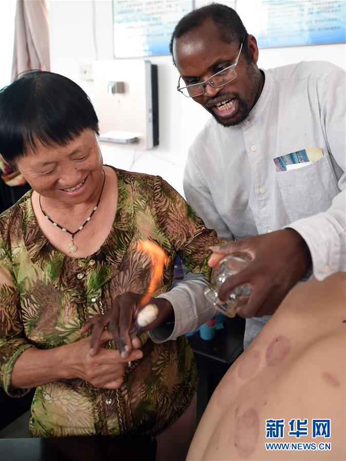 迪亚拉(右)在云南省红河哈尼族彝族自治州开远市大庄卫生院教授乡村医生“拔火罐”的要领(2017年6月6日摄)。 新华社记者 王长山 摄