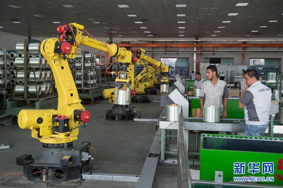 2018年8月28日,在埃及苏伊士运河之畔的泰达工业园区,埃及工人在中国巨石埃及玻璃纤维股份有限公司(巨石埃及)生产车间内工作。 新华社记者孟涛摄