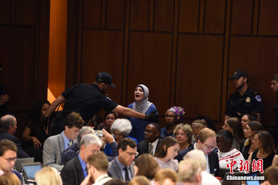 当地时间9月4日,美国参议院司法委员会就布雷特·卡瓦诺出任最高法院大法官举行提名听证会,图为抗议卡瓦诺出任大法官的民众被警方带出听证会大厅。 中新社记者 邓敏 摄