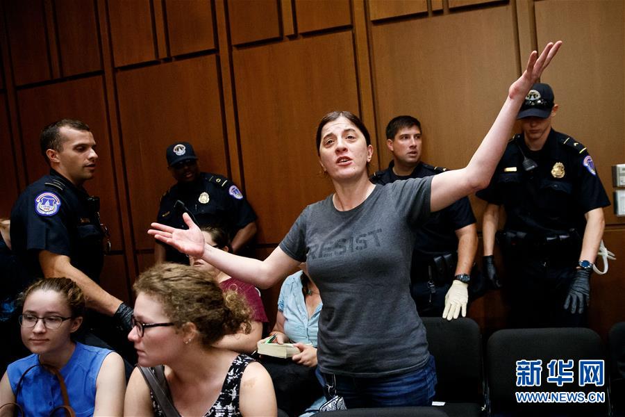 9月4日,在美国华盛顿,反对者在美国国会参议院司法委员会举行的听证会上抗议。 新华社发(沈霆摄)