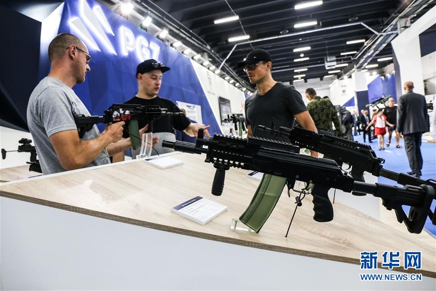 9月7日,在波兰中部城市凯尔采,人们参观第26届波兰国际防务展上展出的武器装备。