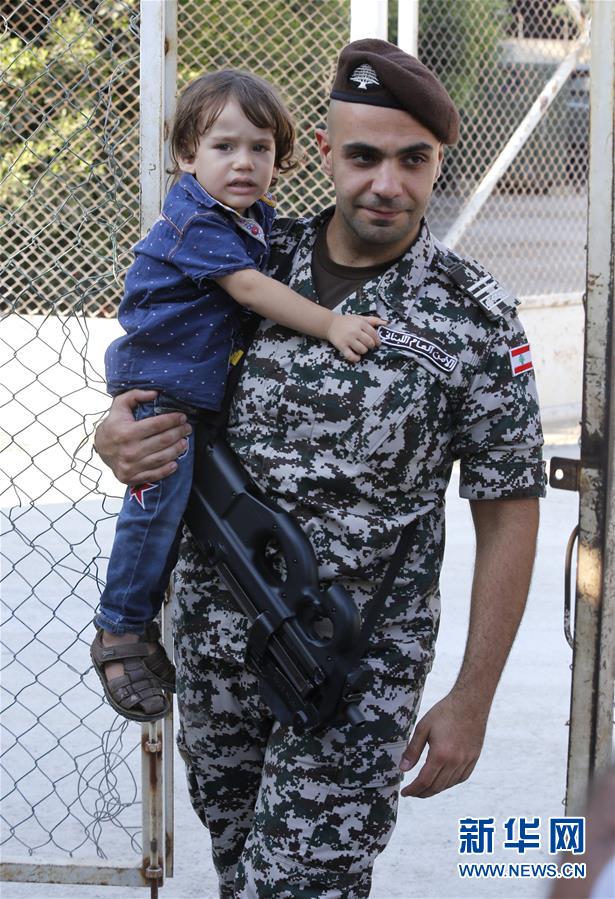 9月9日,在黎巴嫩首都贝鲁特附近一处集结点,黎巴嫩安全人员帮忙抱着一名准备返回叙利亚的儿童。数百名叙利亚难民9日从黎巴嫩返回叙利亚,他们当天通过黎叙边境上的几处口岸重返家园。新华社发(比拉尔·贾维希摄)