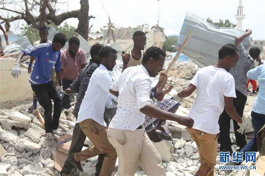9月10日,在索马里首都摩加迪沙,人们在炸弹袭击现场搬运遇难者遗体。