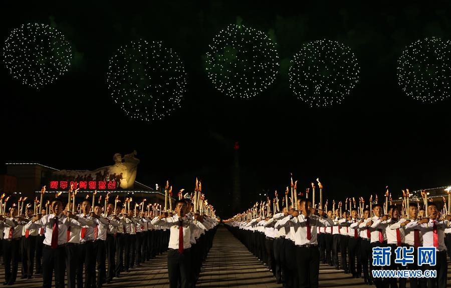 9月10日晚,青年火炬游行在朝鲜首都平壤的金日成广场举行,庆祝朝鲜建国70周年。 新华社记者江亚平摄