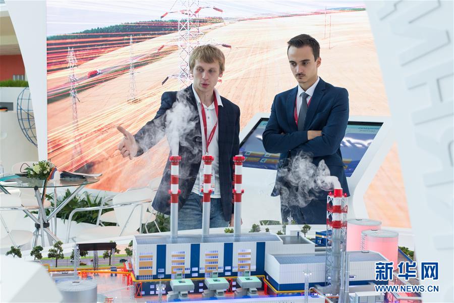9月11日,在俄罗斯符拉迪沃斯托克,工作人员在沙盘模型前交谈。 新华社记者白雪骐摄