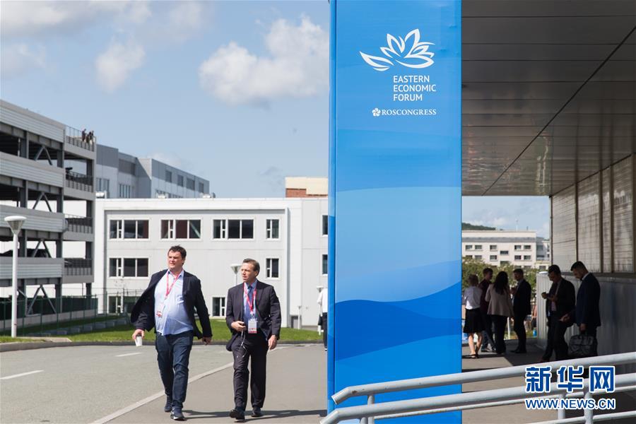9月11日,在俄罗斯符拉迪沃斯托克,人们从东方经济论坛的标志牌旁走过。 新华社记者白雪骐摄