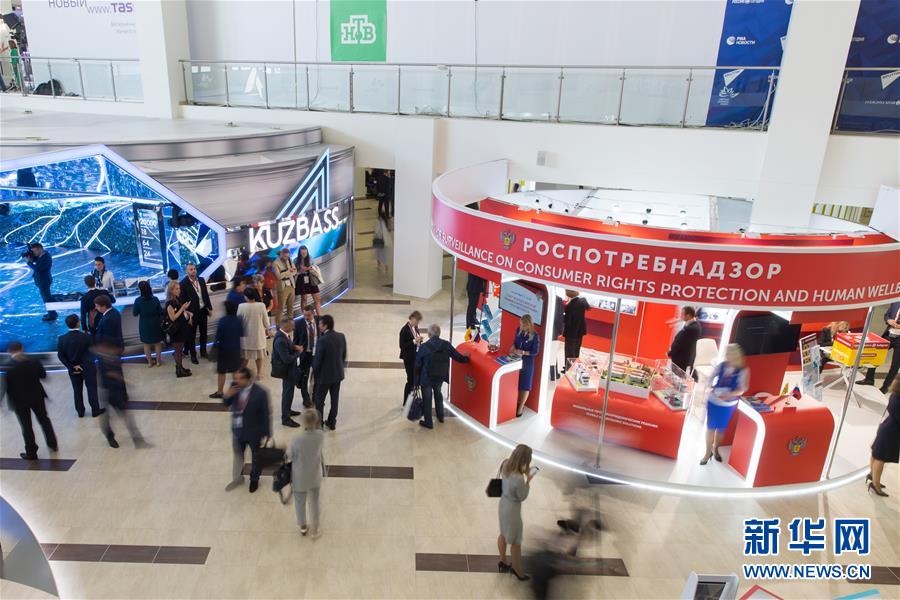 9月11日,在俄罗斯符拉迪沃斯托克,人们参观东方经济论坛上的展位。 新华社记者白雪骐摄