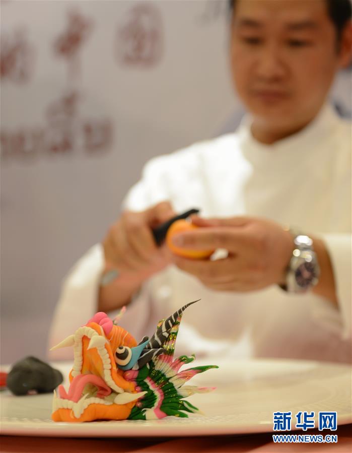 9月12日,在老挝万象,一位厨师表演中国传统“米塑”技艺。