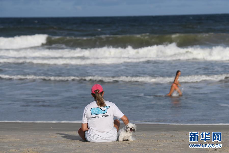 9月12日,在美国北卡罗来纳州威尔明顿市,一名女子带着宠物狗坐在沙滩上。 新华社记者 刘杰 摄