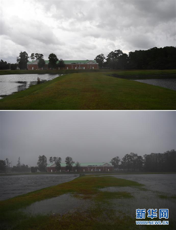 拼版照片:上图为9月13日在美国北卡罗来纳州威尔明顿市拍摄的小雨中的房屋;下图为9月14日在美国北卡罗来纳州威尔明顿市拍摄的暴风雨中的房屋。 新华社记者刘杰摄
