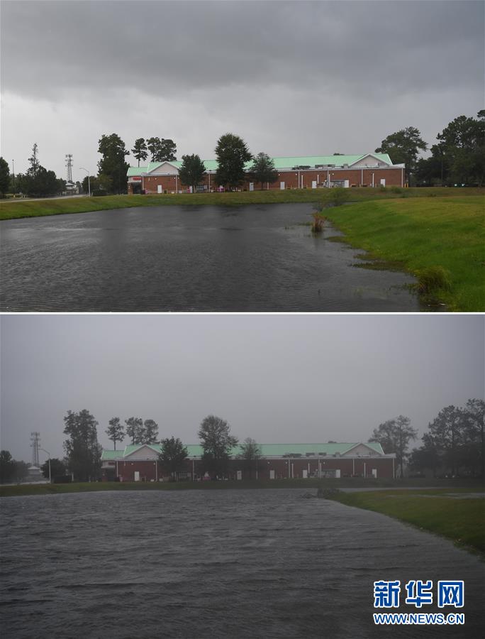 拼版照片:上图为9月13日在美国北卡罗来纳州威尔明顿市拍摄的小雨中的房屋;下图为9月14日在美国北卡罗来纳州威尔明顿市拍摄的暴风雨中的房屋。 新华社记者刘杰摄