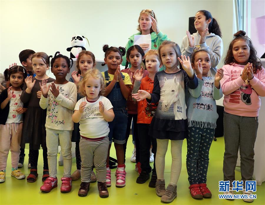 9月14日,在德国北威州首府杜塞尔多夫,小朋友在“熊猫”幼儿园开园仪式上演唱。 新华社记者罗欢欢摄
