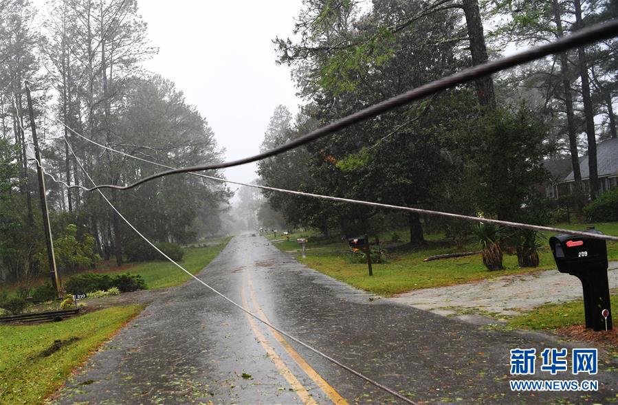 9月14日,美国北卡罗来纳州河湾镇的输电线路在风雨中受损。 新华社记者刘杰摄