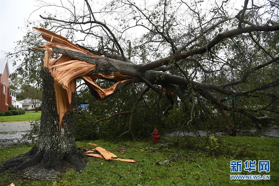 9月14日,在美国北卡罗来纳州靠近海岸线的公路旁,一棵大树被折断。 新华社记者刘杰摄