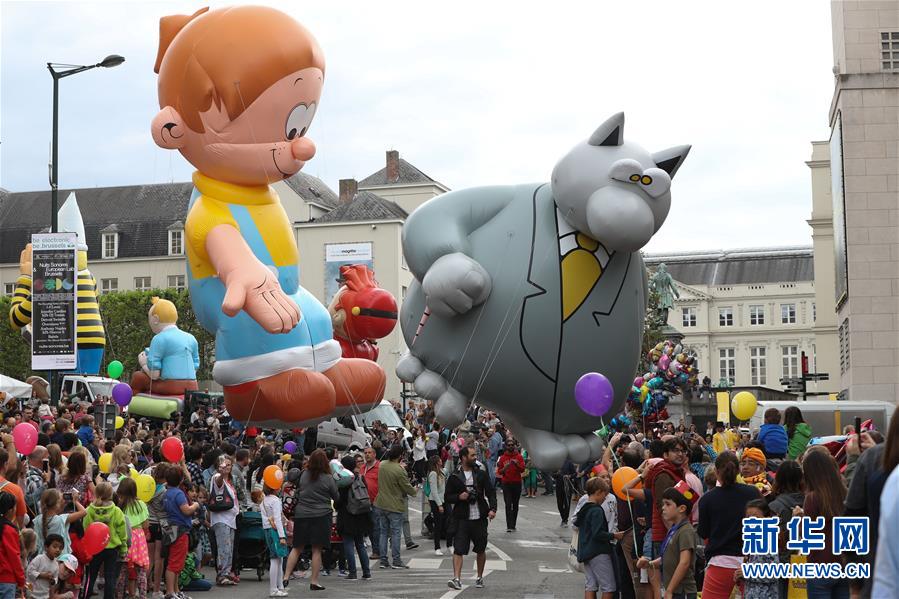 9月15日,在比利时布鲁塞尔,人们参加卡通气球大巡游。 新华社记者郑焕松摄
