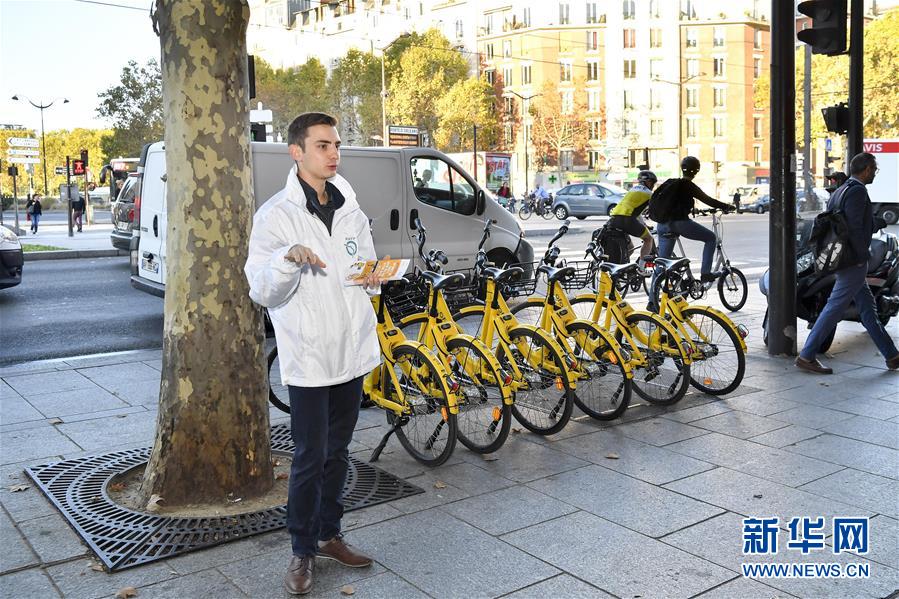9月17日,巴黎大众运输公司的工作人员在法国巴黎“奥尔良门”车站附近派发传单宣传绿色出行。 9月17日至10月14日,ofo与巴黎大众运输公司开展为期一个月的合作,在巴黎有轨电车T3a线路的六个站点定时、定点投放共享自行车,方便市民绿色出行。 新华社记者陈益宸摄