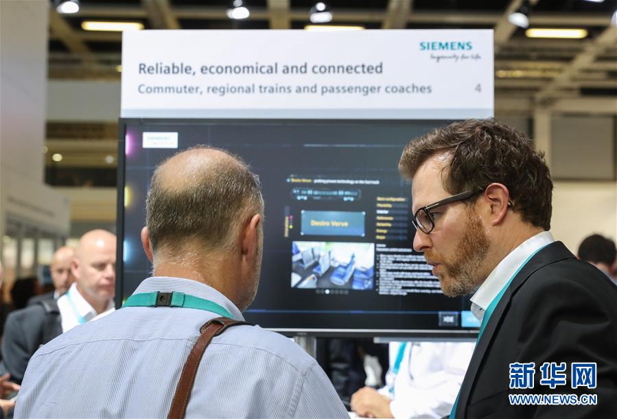 9月18日,在德国首都柏林,西门子公司展区工作人员(右)向参观者介绍轨道交通技术。新华社记者单宇琦 摄