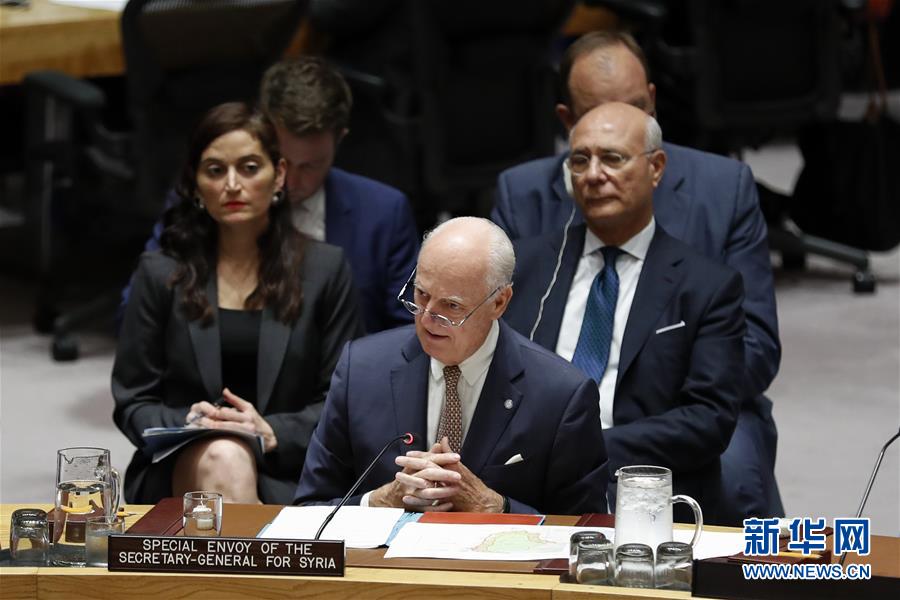 9月18日,在位于纽约的联合国总部,联合国叙利亚问题特使德米斯图拉(前)在安理会叙利亚政治和人道局势公开会上发言。 新华社记者 李木子 摄