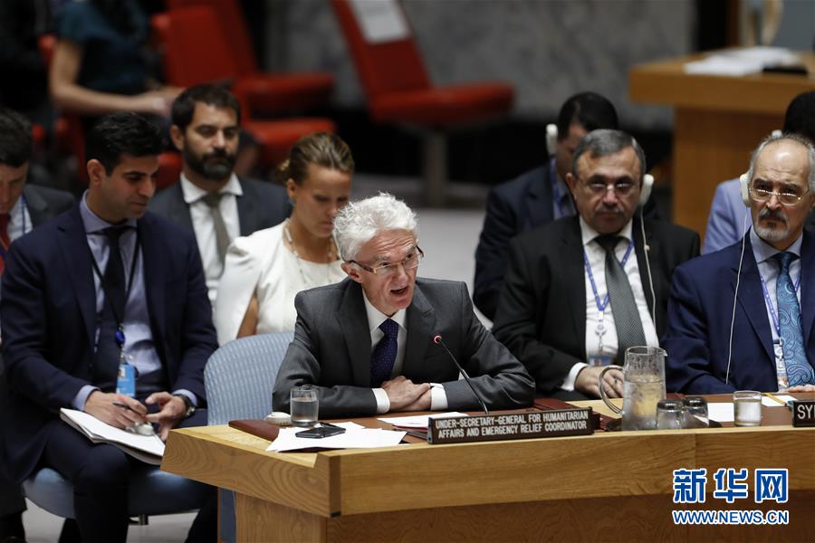 9月18日,在位于纽约的联合国总部,联合国负责人道主义事务的副秘书长马克·洛科克(前排左)在安理会叙利亚政治和人道局势公开会上发言。 新华社记者 李木子 摄